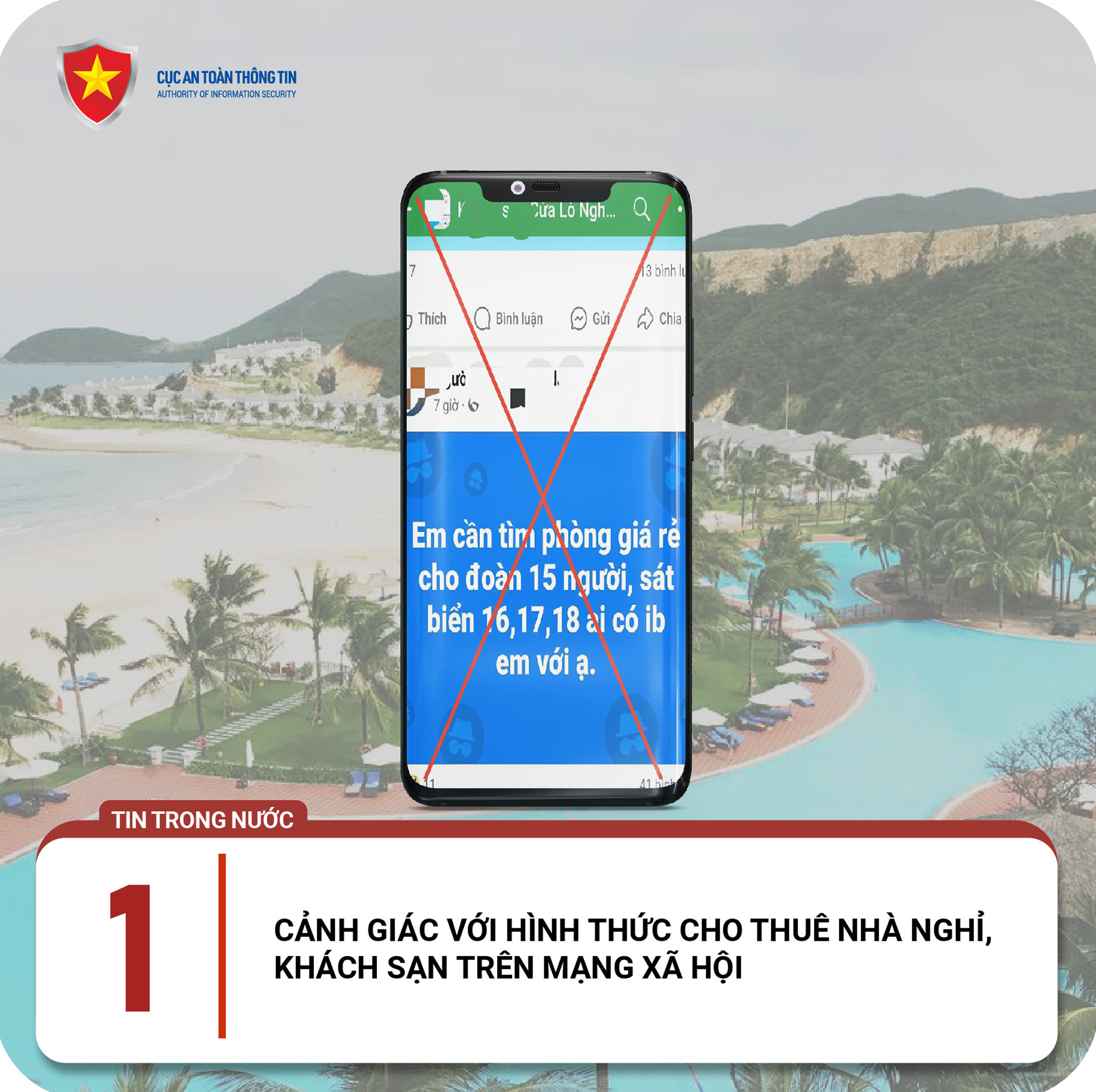 Theo Cục An toàn thông tin, trước sự gia tăng nhu cầu đi du lịch của người dân, gần đây, không gian mạng Việt Nam xuất hiện nhiều đối tượng giả danh, xưng là nhân viên làm việc tại các khách sạn, homestay, resort... để mời chào, dụ dỗ nạn nhân đặt phòng và chiếm đoạt tiền đặt cọc.